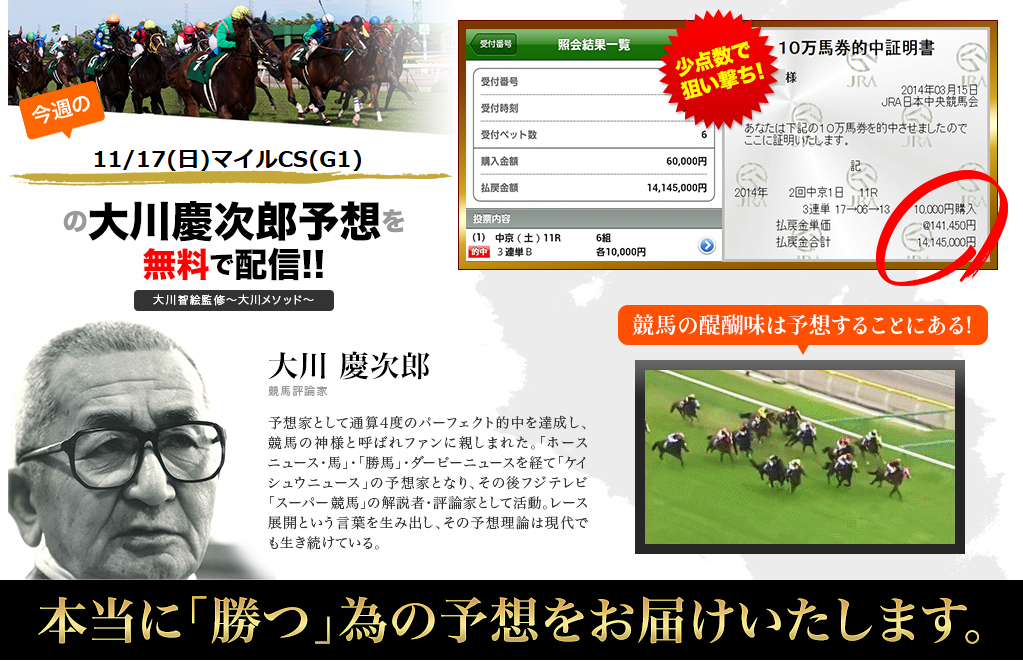 **大川慶次郎〜競馬の神様と女神のパーフェクト馬券メソッド〜**は、日本一の競馬予想家として知られ、伝説的な1日12レースのパーフェクト的中を4度達成した故・大川慶次郎氏の予想を正統に継承する唯一の競馬情報サイトです。