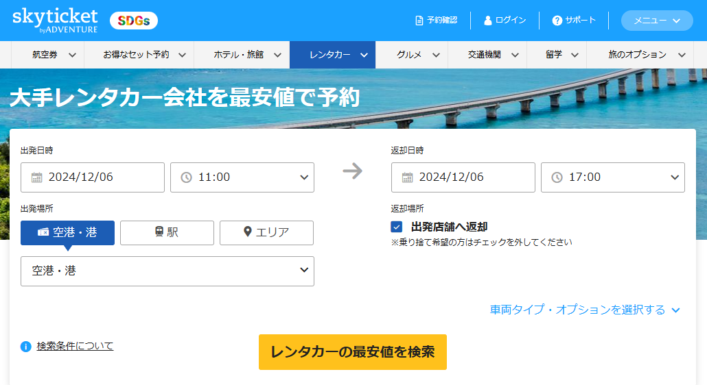 全国の格安レンタカーを簡単比較・検索予約【skyticketレンタカー】